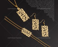 ست گردنبند دستبند و گوشواره زلف یکی از ستهای بسیار جذاب است که طرحی زیبا و دوستداشتنی و کیفیت ساختی مطلوب دارد. این ست از یک گردنبند و دستبند و یک جفت گوشواره تشکیل شده است که پلاک آن و گوشوارهها از طرح نوشته بسیار زیبای برخوردارند.